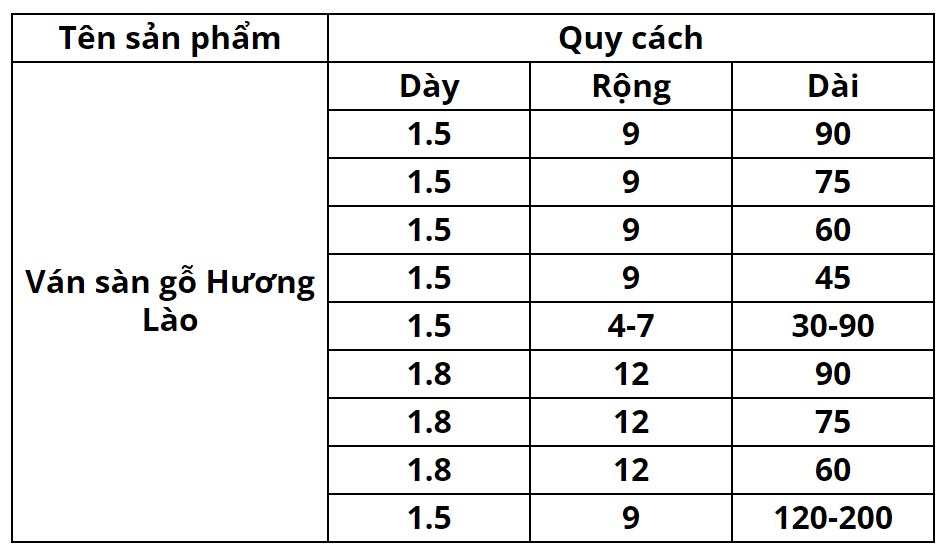 Sàn gỗ Hương Lào được xẻ nguyên thanh từ thân cây gỗ Hương Lào. Ván sàn gỗ Hương Lào được sản xuất với nhiều quy cách khác nhau, mang đến nhiều sự lựa chọn cho khách hàng phù hợp với diện tích và cách lát sàn.